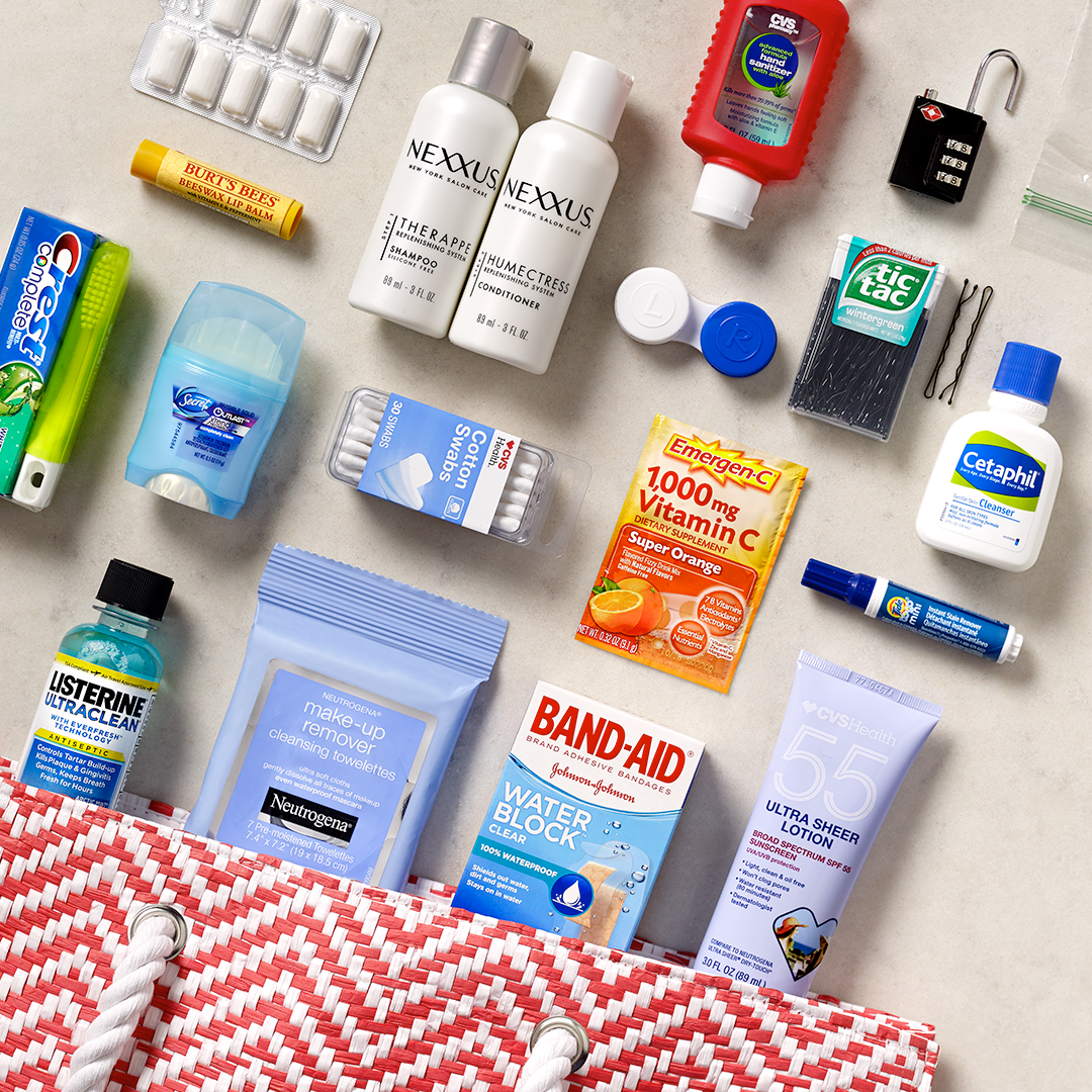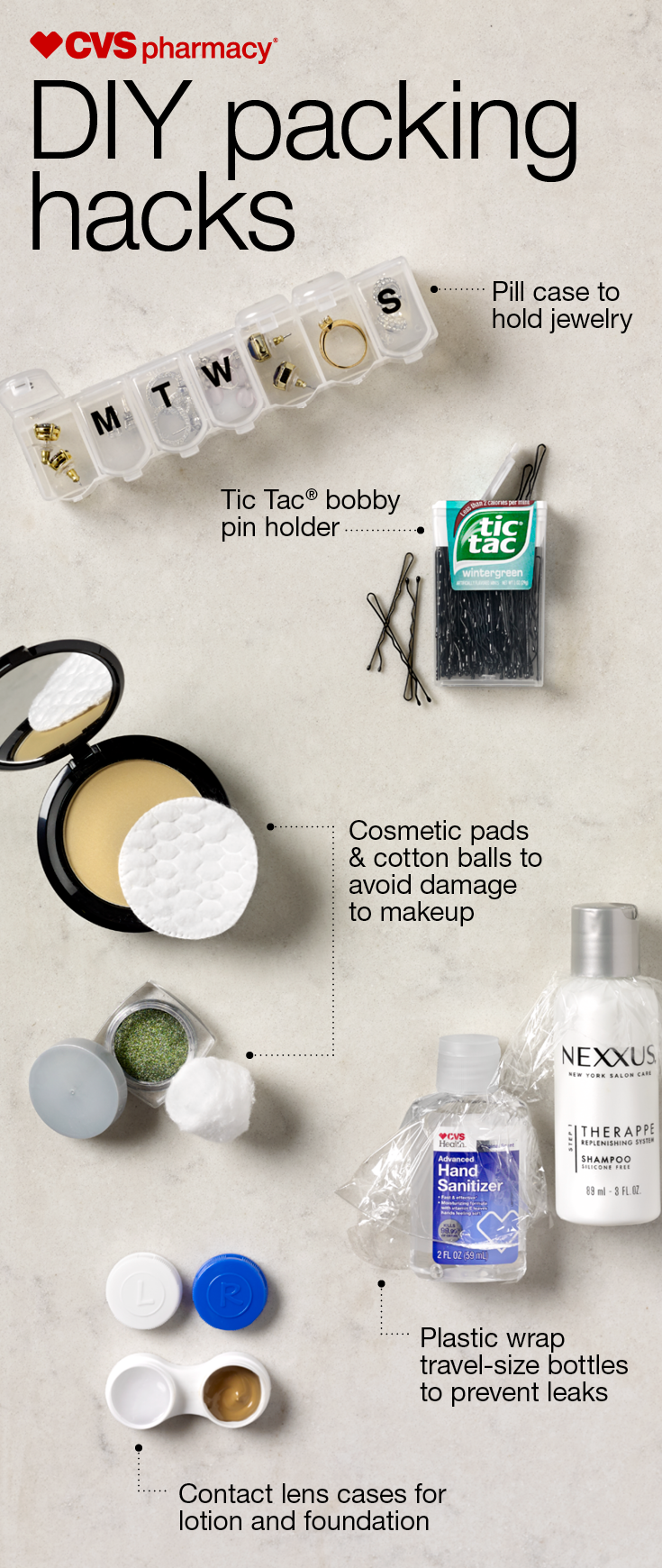 Social post for Instagram and Pinterest featuring travel size products and DIY packing hacks to get you to your destination without hassle or delay.